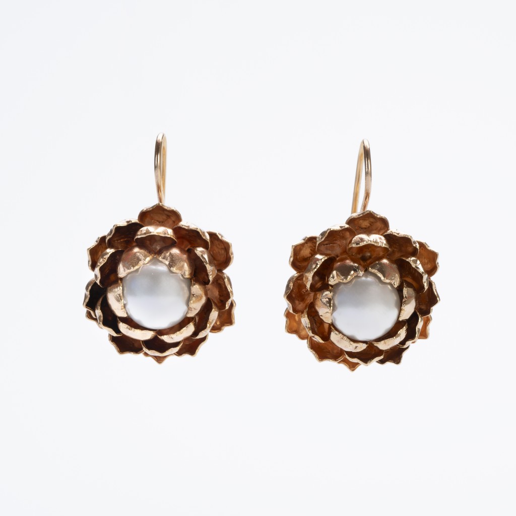 Be enchanted by the refined beauty of these floral earrings made of Demirouge alloy, an exclusive French alloy composed of copper and zinc, which gives the jewelry an antique golden patina. Each petal, handcrafted in Tuscany by our skilled artisans, delicately opens to reveal two luminous imitation pearls, creating an eye-catching play of light and shadow.