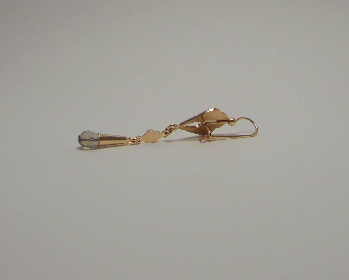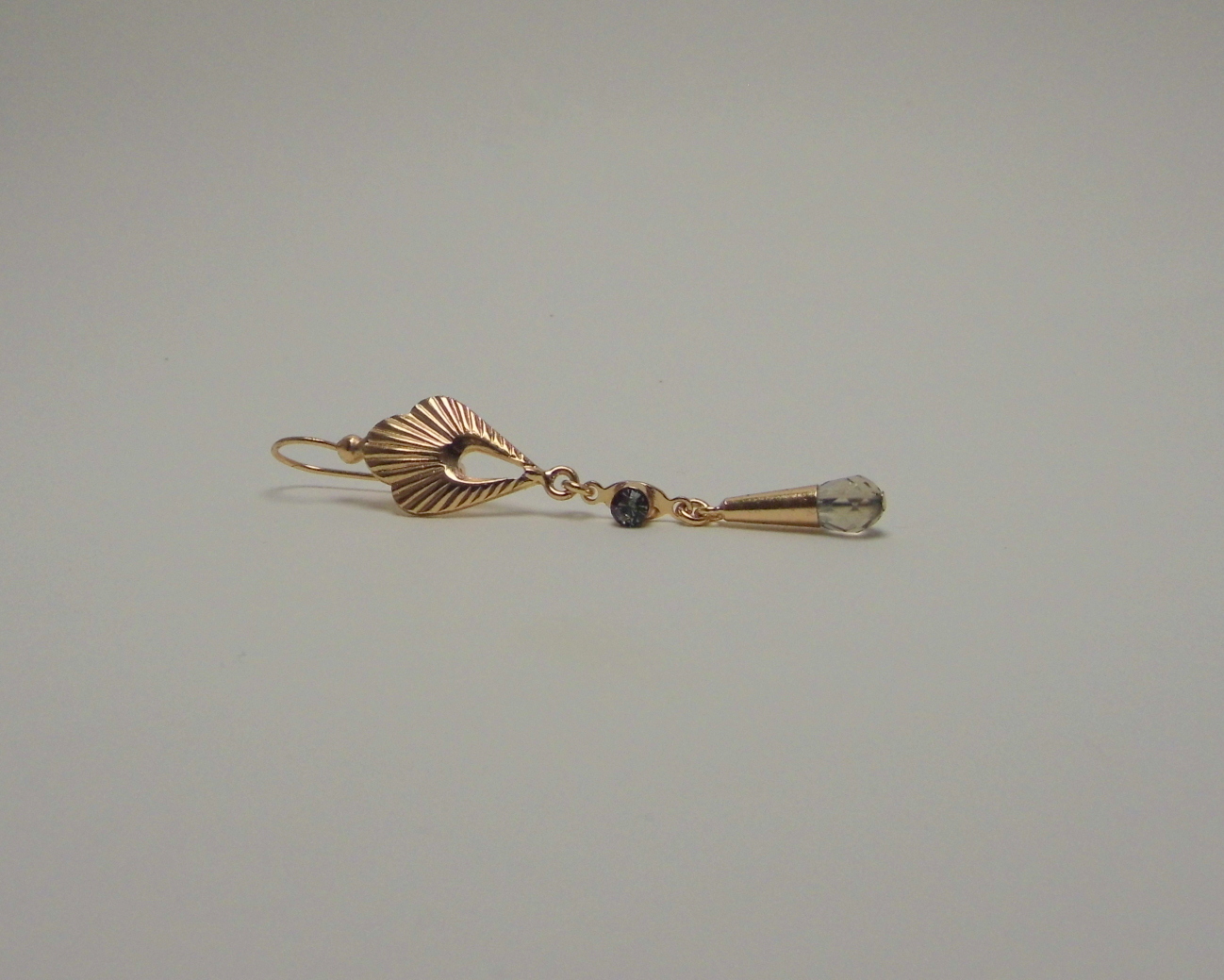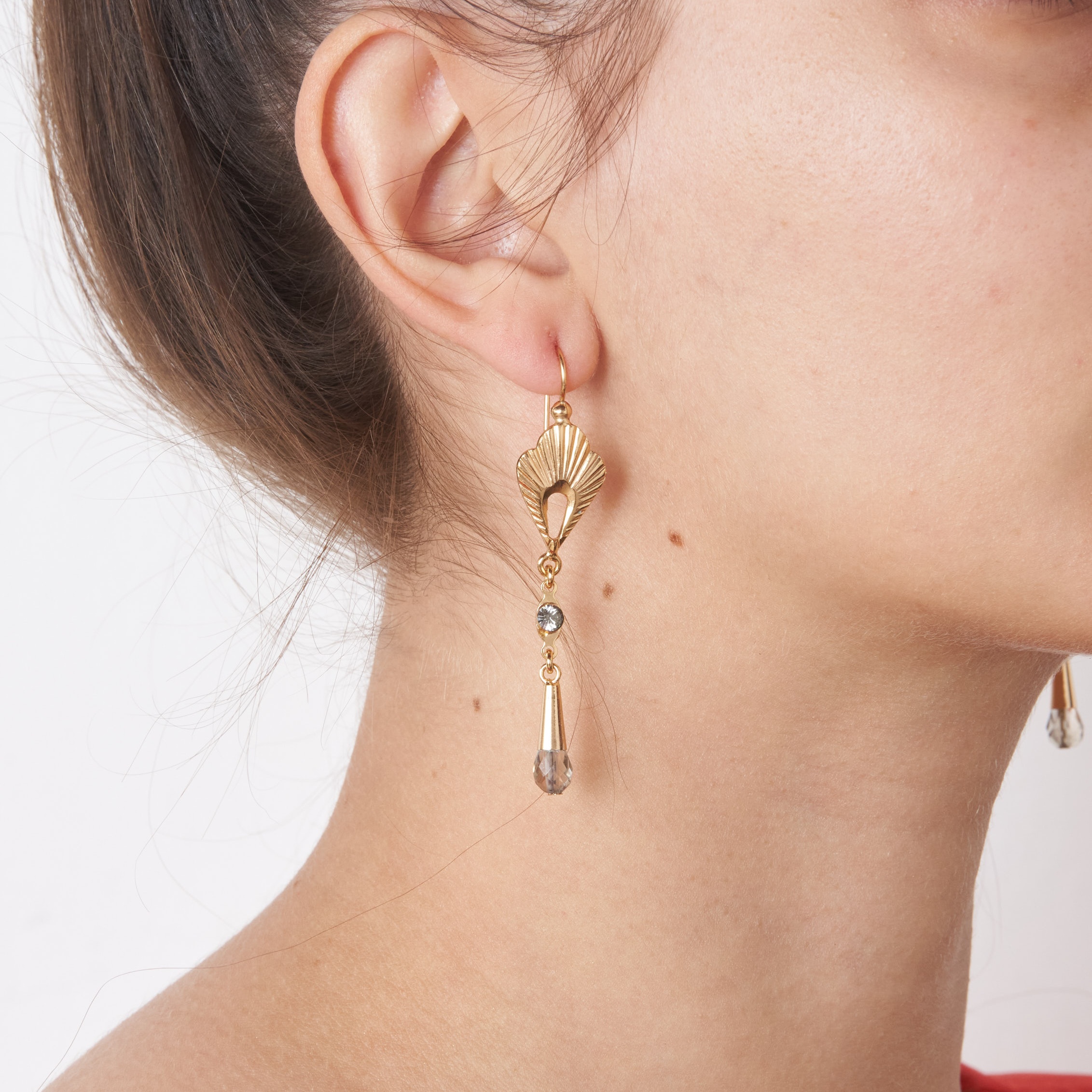 Drop Drop and Smoked Crystal Earrings, Edwardian Style, 14K Gold Gilt