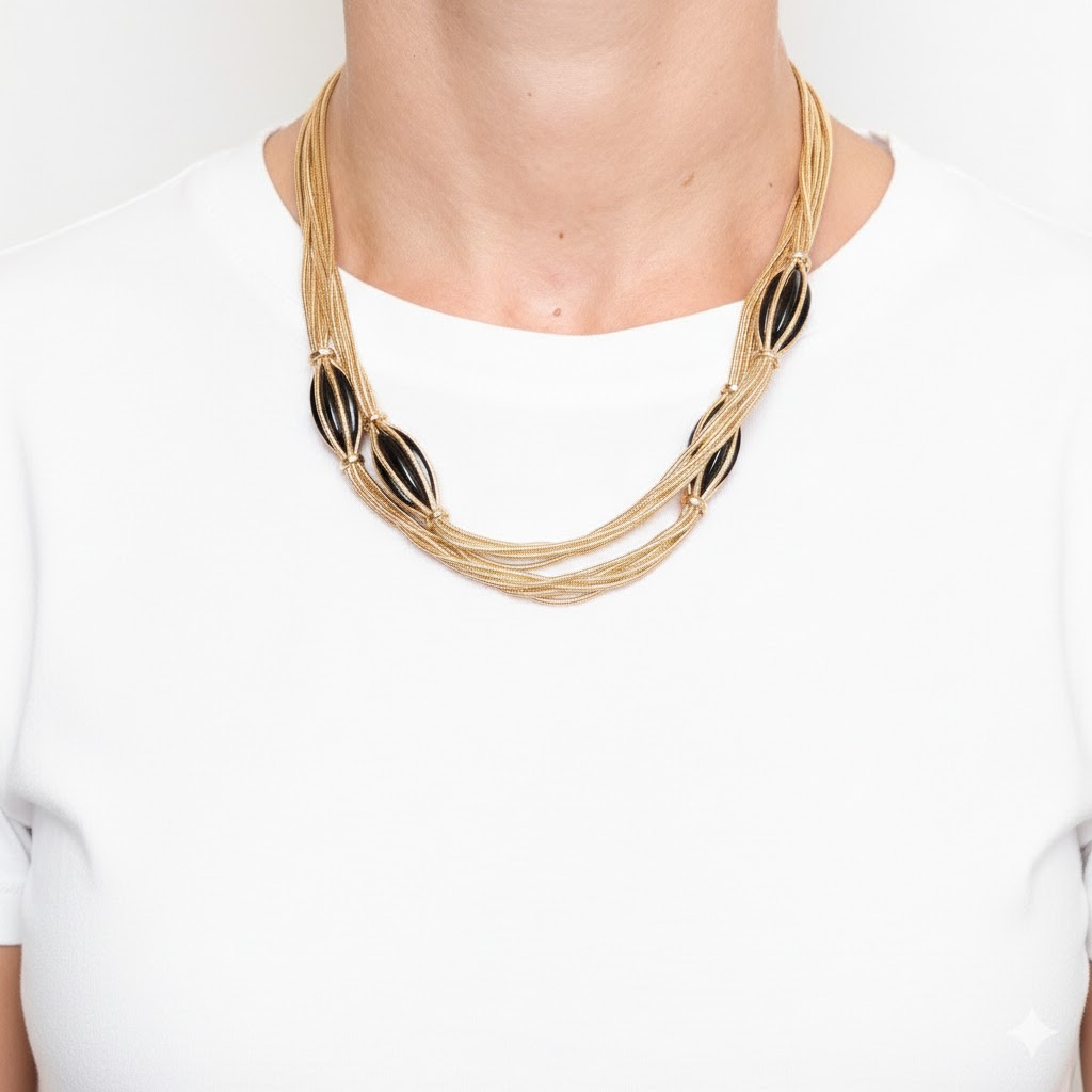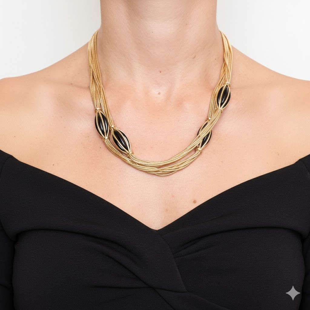 The quintessence of Art Deco elegance. Long Necklace with 6 strands of golden Snake Chain and precious black Sculpted Details (Glossy Onyx effect). The perfect piece of jewelry for your winter evenings.