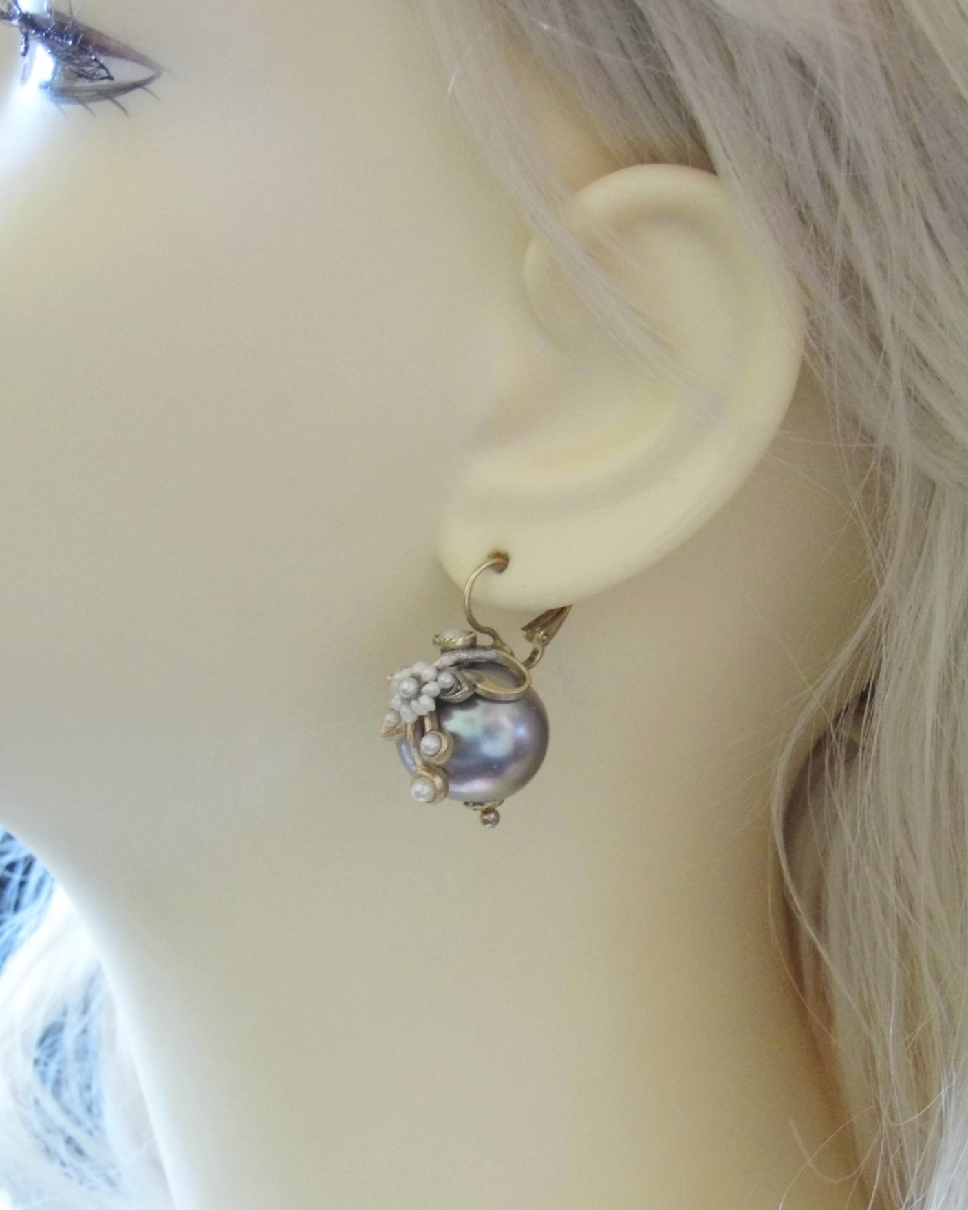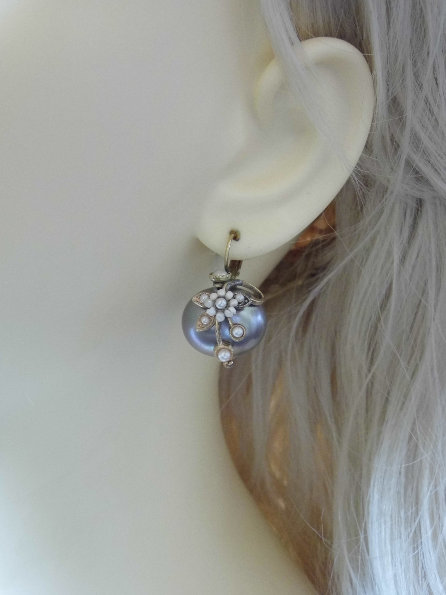 Retro Flower Earrings with River Beads and Grey Shell, Handmade