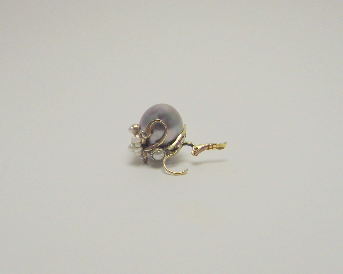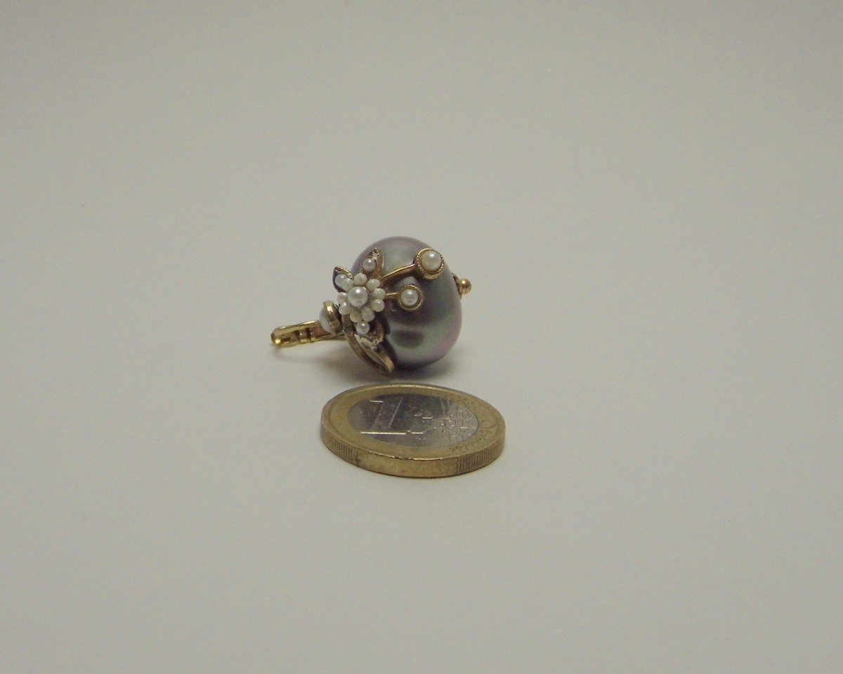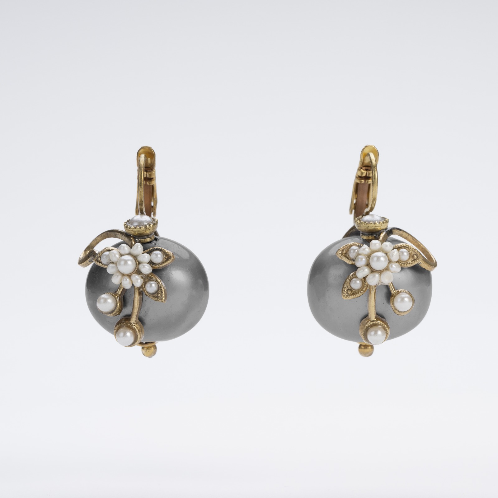Each sphere is embellished and topped with a delicate handmade flower composed of a central river pearl and small pearls strung with skill.