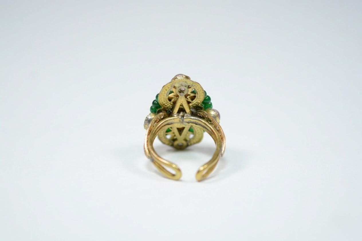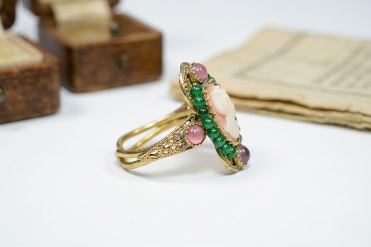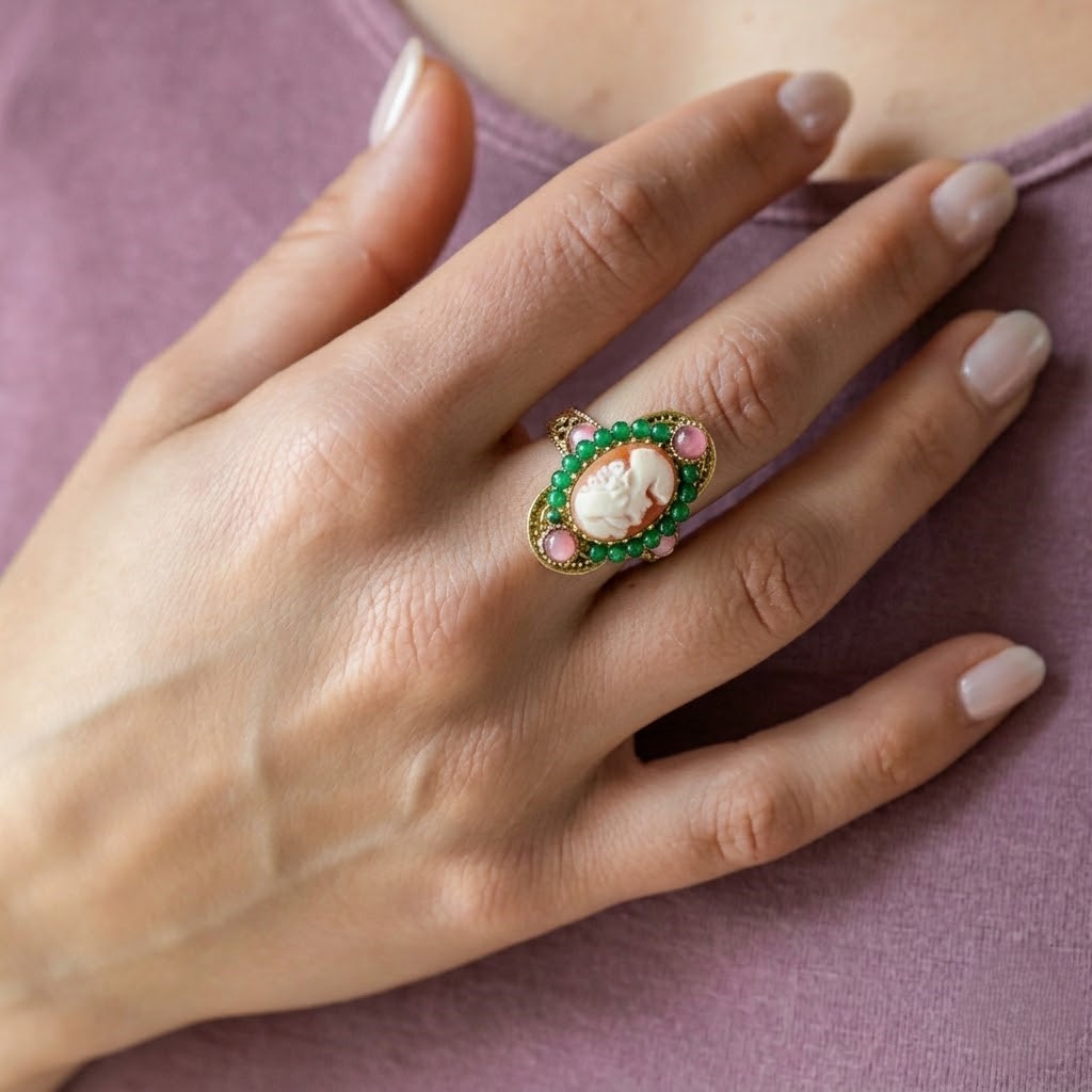 Splendore di corte: un anello che celebra la gioia di vivere con un tocco di regalità. Un cammeo delicato, incastonato in una cornice di ottone dorato, cattura lo sguardo con la sua eleganza senza tempo. Ma è l’esplosione di colori vivaci, l’avventurina verde e i vetri rosa, a donare a questo gioiello un’anima frizzante e gioiosa, tipica del Sud Italia.