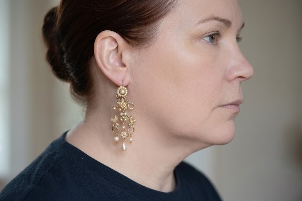 Orecchini Borbonici Lunghi con Perle di Fiume Rosate e Fiori in Ottone - Artigianato Campano