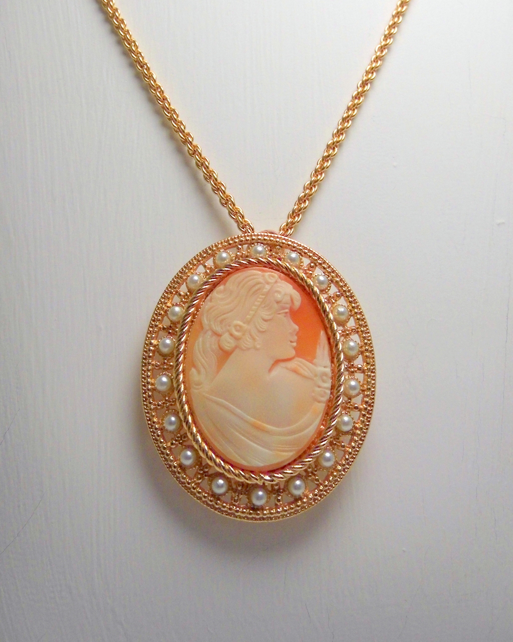 Un raffinato giro di perle d’imitazione, esalta la luminosità naturale dell’incisione, rendendo questa spilla-ciondolo un pezzo da collezione.